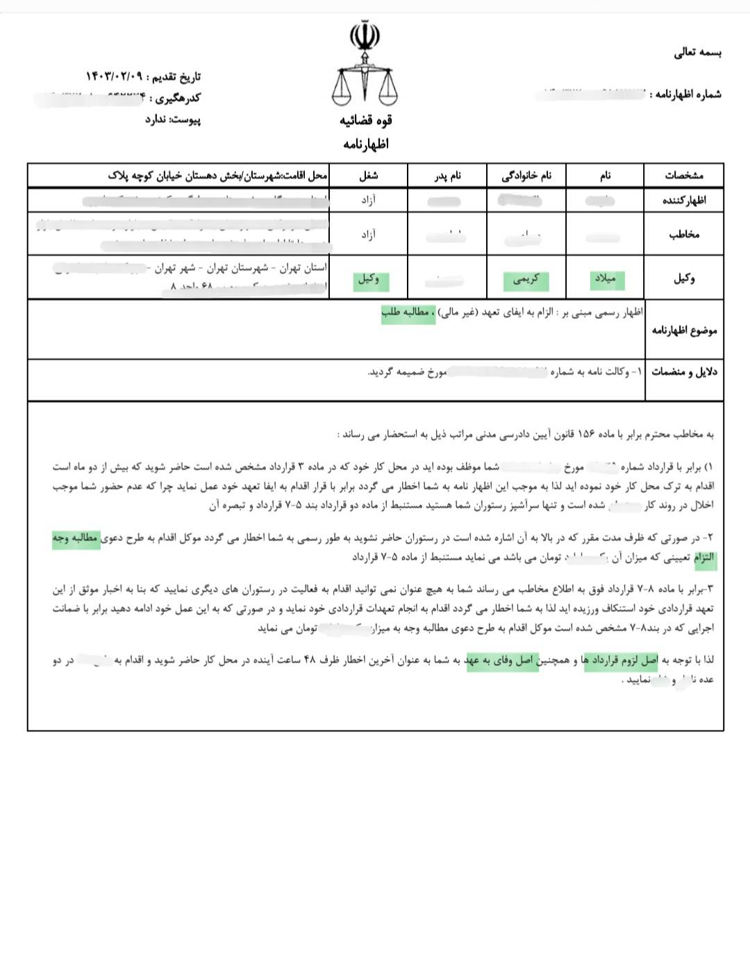 اظهارنامه ذیل توسط وکیل متخصص مجموعه هموکیل، جناب آقای میلاد کریمی در خصوص موضوع فوق الذکر، تنظیم شده است