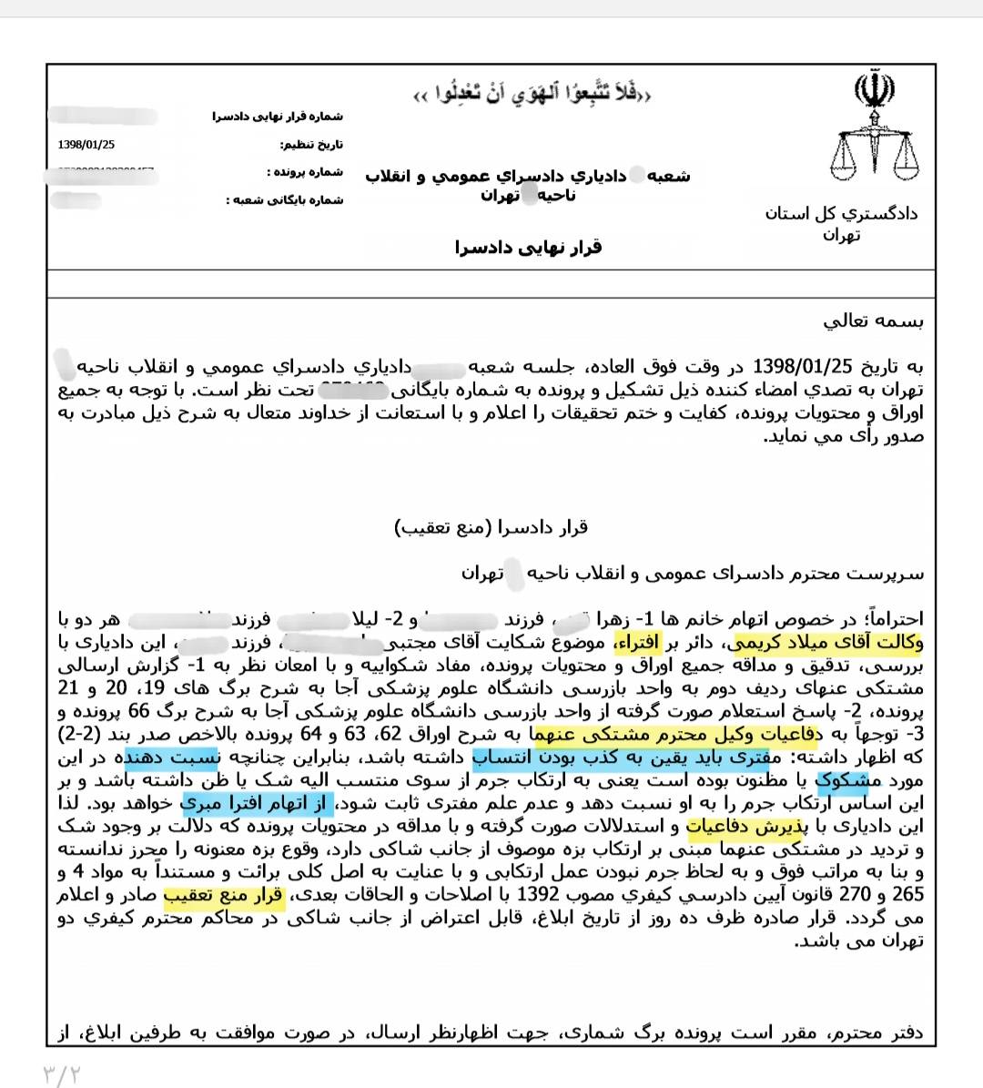 در ذیل، یک نمونه از آرای اخذ شده توسط وکیل مجموعه تخصصی هم وکیل،جناب آقای میلاد کریمی را در خصوص جرم افترا بررسی مینماییم: